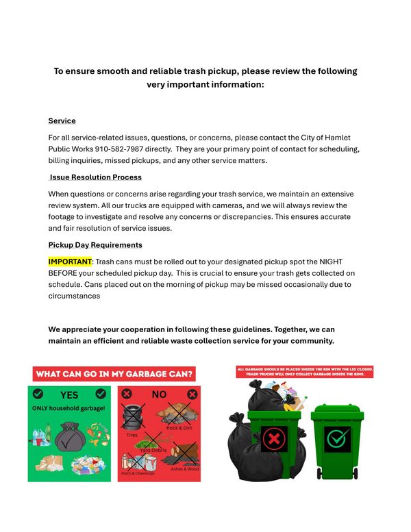 For on time trash pick up, please put your cans out the night before your scheduled pick up time.